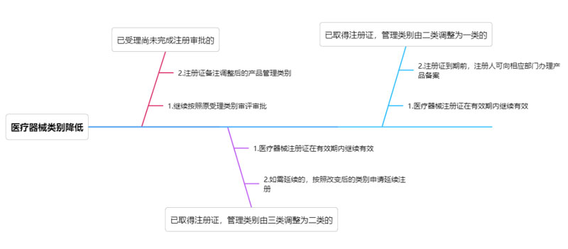 二、管理類(lèi)型升高 1、已受理醫療器械 對于公告發(fā)布之日前已受理尚未完成注冊審批(包括首次注冊和延續注冊)的醫療器械,藥品監督管理部門(mén)繼續按照原受理類(lèi)別審評審批,準予注冊的,核發(fā)醫療器械注冊證,限定醫療器械注冊證有效期截止日期為過(guò)渡期截止日期,并在注冊證備注欄注明調整后的產(chǎn)品管理類(lèi)別。 2、已取得二類(lèi)醫療器械注冊證